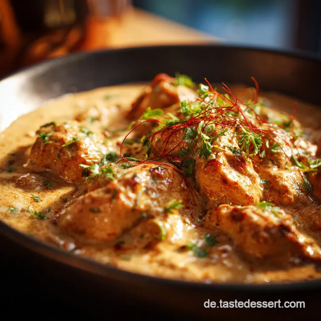 Wenn dieses Curry langsam auf dem Herd blubbert, durchströmt ein Duft von geröstetem Kardamom, Zimt und gerösteten Nüssen die ganze Wohnung. Dieses Chicken Korma ist nicht nur ein Essen, es ist eine olfaktorische Umarmung, pure Entspannung für die Seele.