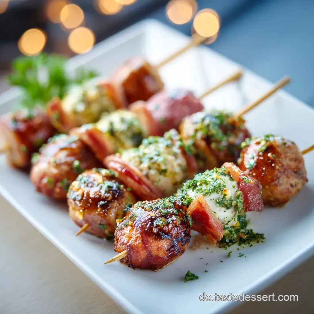 Nutzen Sie eine urige Holzplatte oder ein Schieferbrett als Unterlage. Streuen Sie zum Abschluss großzügig frischen Schnittlauch über die angerichteten Spieße, um Farbe und Frische ins Spiel zu bringen.