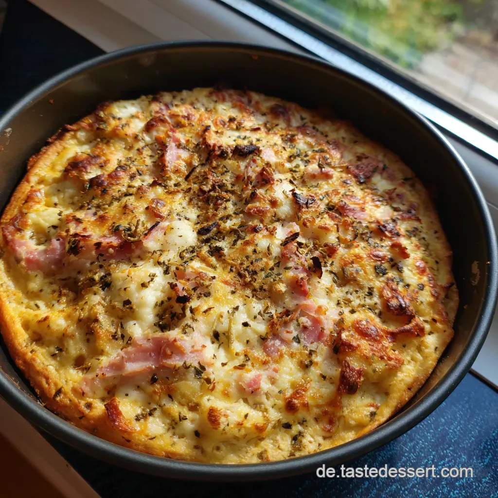Stellt euch eine Art dicke Quiche vor. Aber mit dem vollen, herzhaften Geschmack einer echten Pizza. Die Basis wird einfach nur zusammengerührt oder kurz geschüttelt.