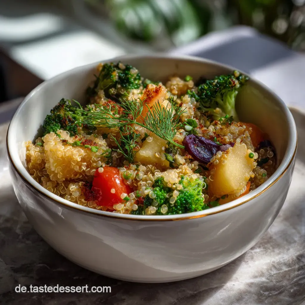 Dieses Gericht ist ein echtes Experimentierfeld. Die Quinoa dient als Leinwand, auf der das bunte Gemüse und die cremige Sauce ihre Wirkung entfalten. Wir nutzen hier die Kraft der Pseudocerealien und kombinieren sie mit einer modernen, pflanzlichen Saucen Komposition.