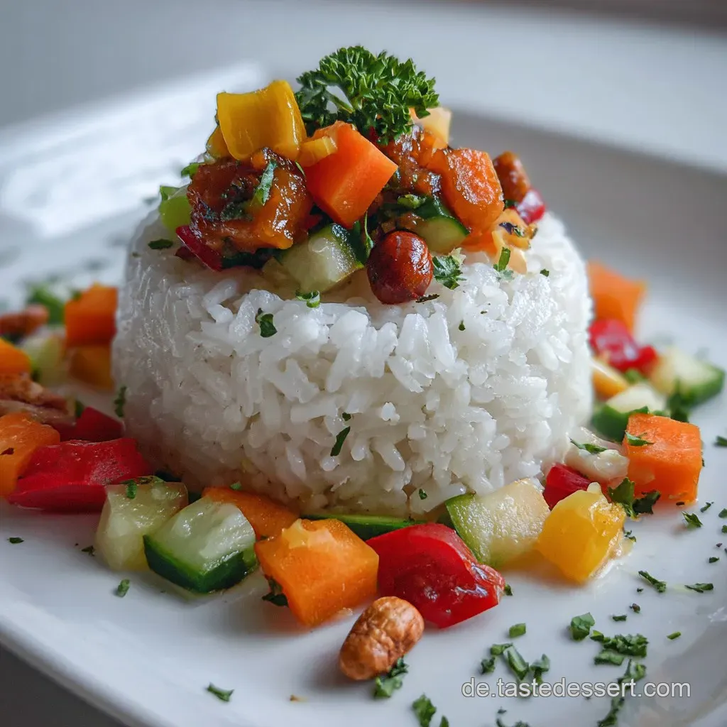 Bereite den Reis zunächst separat zu. Koche den Reis nach Packungsanleitung, um die perfekte Konsistenz zu erzielen. Schneide währenddessen das Gemüse in mundgerechte Stücke und brate es kurz in einer Pfanne mit etwas Öl an, bis es knackig ist. Würze das Gemüse nach Belieben und mische dann den fertig gekochten Reis unter. Diese Methode stellt sicher, dass sowohl Reis als auch Gemüse ihre optimale Textur behalten. Ähnliche Prinzipien der Texturkontrolle findest du auch bei der Zubereitung von Pakistanisches Pilau mit Hähnchen Fluffiger Reis durch YakhniBrühe.