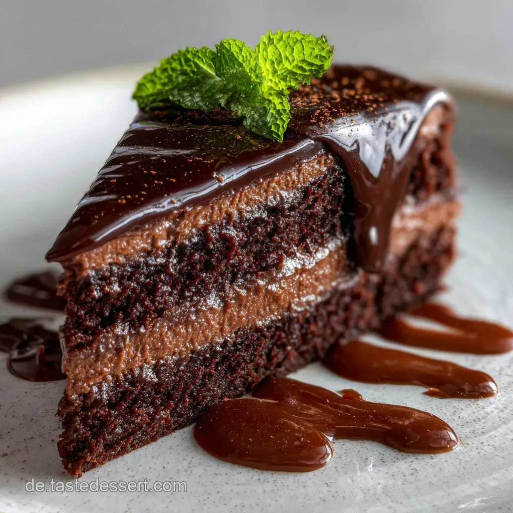 Für ein echtes Restaurant Feeling kannst du einen Spiegel aus Fruchtpüree (z. B. Maracuja oder Himbeere) auf den Teller geben. Die gelbe oder rote Farbe kontrastiert wunderbar mit dem dunklen Braun des Kuchens. Ein paar frische Minzblätter oder essbare Blüten setzen den optischen Akzent.
